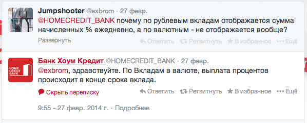 У банка есть аккаунты во всех популярных социальных сетях России, вы всегда можете задать вопрос онлайн вконтакте, твиттере или одноклассниках. Операторы практически моментально ответят на ваши вопросы, помогут решить проблемы. Ниже пример оперативного ответа банка, в твиттере: