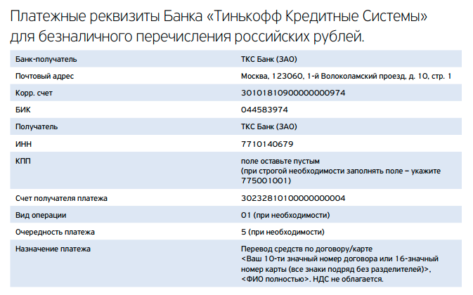 - Бесплатный банковский перевод из любого банка, срок зачисления 1 - 2 рабочих дня, реквизиты для пополнения вашей кредитной карты можно найти на сайте банка - tcsbank.ru/about/documents/properties/ или в вашем интернет банке.