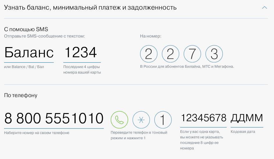 - Позвонить по бесплатному телефону 8 800 5551010, далее нажать 1 и ввести 8 последних цифр вашей кредитной карты, после чего ввести вашу кодовую дату.