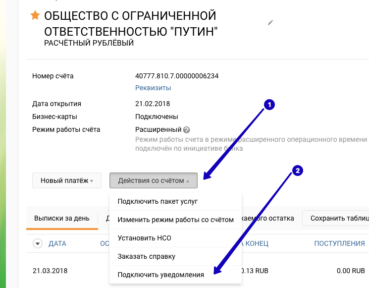 Чтобы подключить, нужно зайти в раздел «Счета и выписки», далее следует выбрать необходимый счет для подключение услуги, далее нажать «Действия со счетом», «Подключить уведомления».
